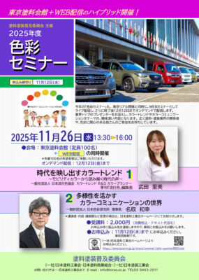 日本塗料工業会、日本塗料商業組合、日本塗装工業会の3団体で構成する塗料塗装普及委員会は11月26日午後、東京塗料会館会場とウェブ配信のハイブリッド形式による色彩セミナーを開催した。