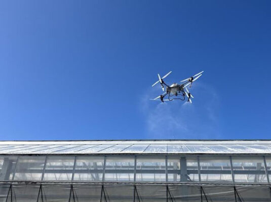 同社グループが開発に取り組む園芸施設用の高機能遮熱剤は、気温の上昇を防ぎつつ、作物の成長に欠かせない太陽光は透過できる光透過型の遮熱塗料。ビニールハウスなどへドローンから散布しても機能性を損なわないよう開発を進めている。