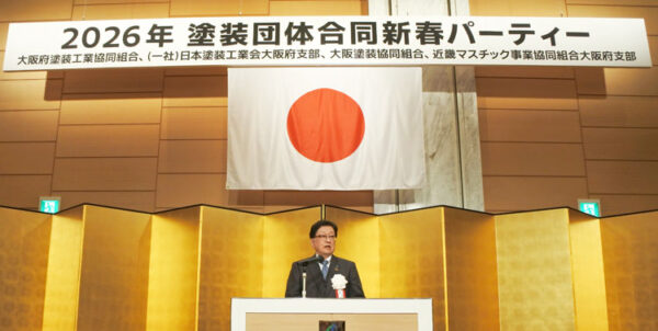 大阪府塗装工業協同組合(小掠武志理事長)、日本塗装工業会大阪府支部(三木良介支部長)、大阪塗装協同組合(松岡充史理事長)、近畿マスチック事業協同組合大阪府支部(竹林正浩支部長)の4団体共催による「2026年塗装団体合同新春パーティー」は1月26日、シティプラザ大阪で開かれた。