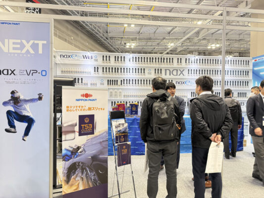 日本ペイントは、水性ベース「nax E-CUBE WB」、機能性クリヤー「TSクリヤー3」を出展。技術継承を効率化し、省エネ・コスト削減にも役立つVR塗装教育を紹介した。
