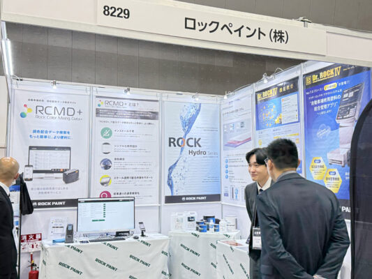 ロックペイントは、水性塗料「ネオウォーターベース」「ロックハイドロシリーズ」の展示や、調色作業支援システム「Dr.ROCKⅣクラウドシステム」の塗装実演を行った。
