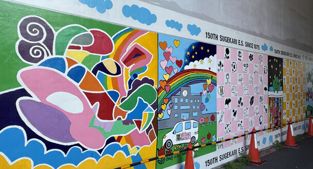 小学生が高架下に壁画アート 日ぺと森商事が協力